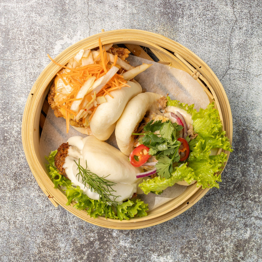 3pcs combo with: 1pcs fried chicken bao, 1pcs classic: braised pork bao and 1pcs panko fried portobello mushroom